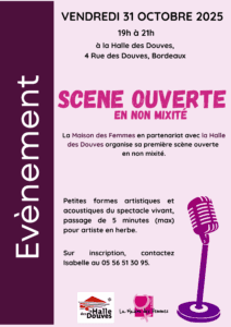 Nous proposons une scène ouverte de spectacles vivants en non-mixité. Venez nombreux.ses le vendredi 31 octobre à 19h!